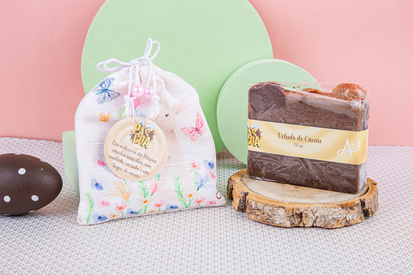 Para tornar a experiência ainda mais especial, o sabonete vem em um saquinho de algodão, com pintura em aquarela inspirada na Páscoa — um detalhe delicado que transforma o produto em um presente cheio de significado.