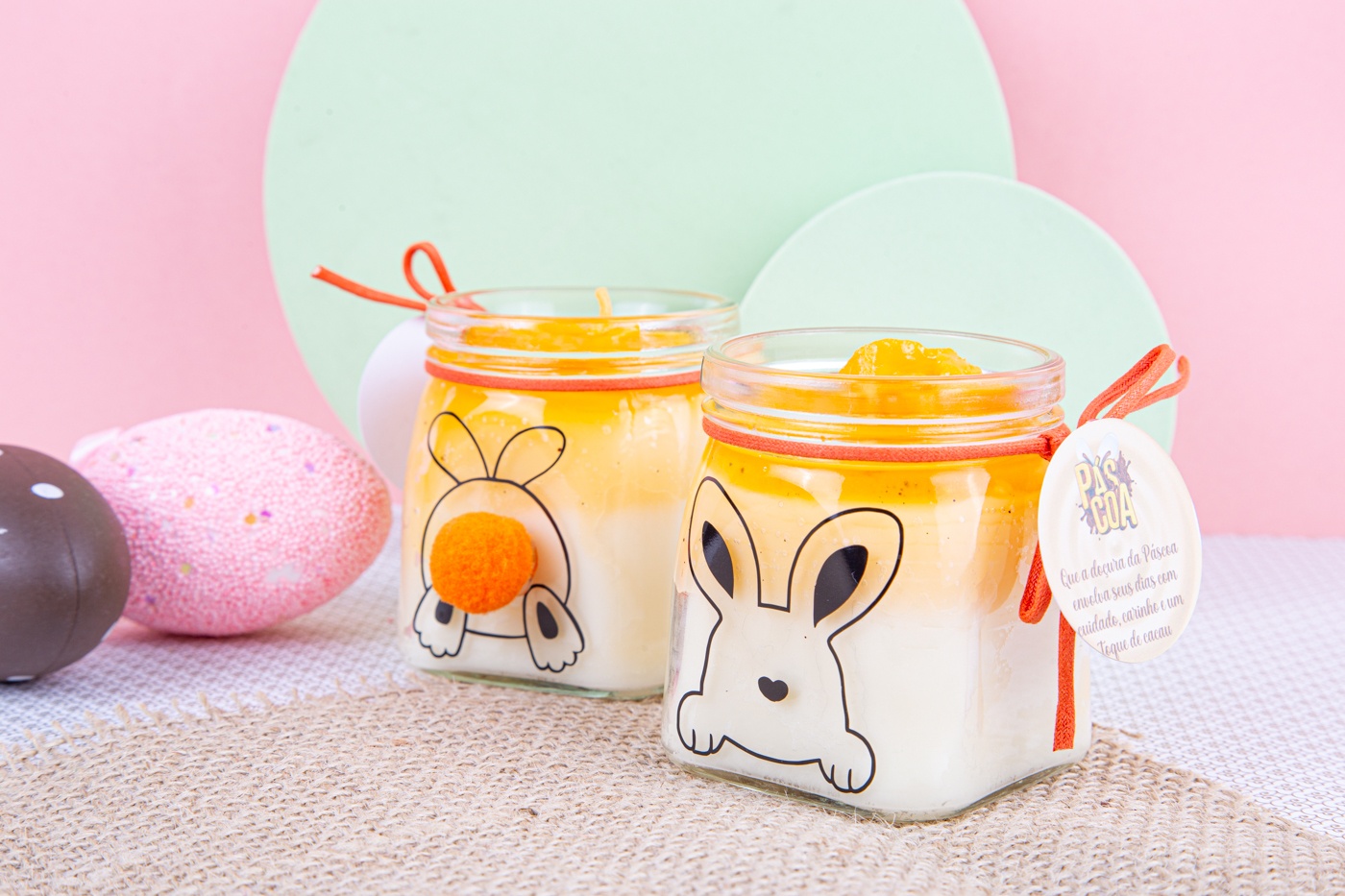 E para deixar tudo ainda mais encantador, o vidrinho recebe um detalhe cheio de carinho: um pompom delicado inspirado no rabinho do coelho — um toque criativo que transforma a vela em um presente de Páscoa único.